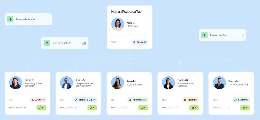 Our platform provides actionable insights into how potential hires will integrate with your existing team, helping you create a balanced, productive, and harmonious workplace. Strengthen team dynamics and drive success with every new hire.