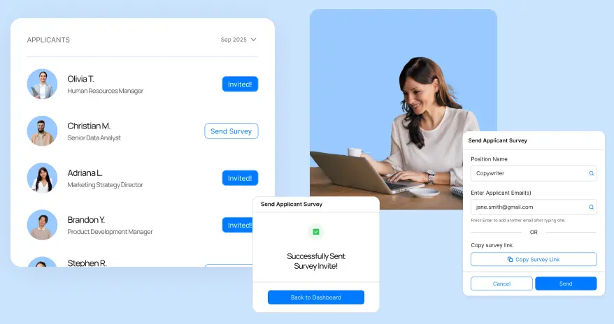 Effortlessly send personality test invitations to potential hires through our user-friendly platform. Customize the invitations with your branding and tailor the assessments to fit the specific requirements of the roles you’re hiring for. Ensure candidates can easily access and complete the tests, whether on desktop or mobile devices.
